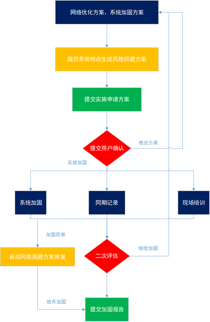 一个典型安全加固服务过程,通常可以分为下面五个阶段:制定方案、申请与确认、操作实施、二次评估、产生报告。安全加固服务实施的流程如下: